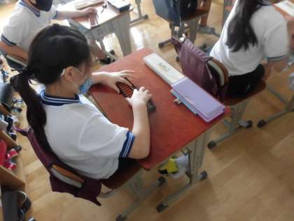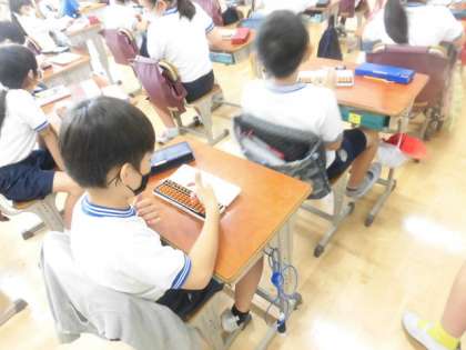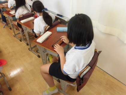 4年2組の子どもたちがそろばんの授業をしています。今日は、5玉の使い方を勉強していました。