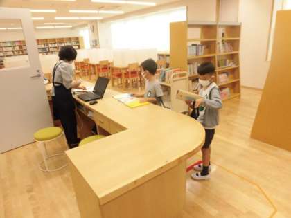 1年4組の子どもたちが夏休みに読む本を借りに図書室に来ています。本を選んで、借りています。借り方もしっかりと覚えています。