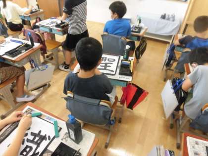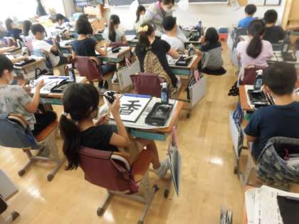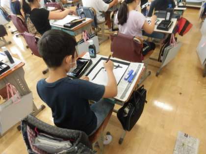 4年2組の毛筆の授業です。一人一人違う字をかいています。何の字を書いていたかは、子どもに聞いてみてください。みんな丁寧に書いています。