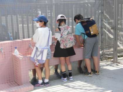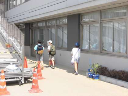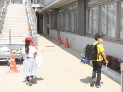 学習支援も4日めとなりました。今日も気温が上昇していますが、子どもたちは元気に登校して、手洗いをしっかりとして教室に向かっています。今日は階段の工事の関係で、すべての学年が1階の昇降口から教室に入っています。