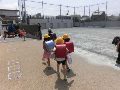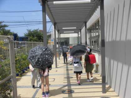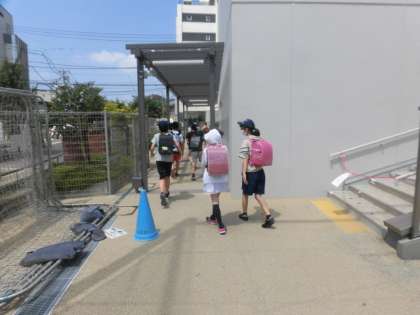 学習を終えて子どもたちが下校していきます。今日もとても暑くなっています。家まで気をつけて帰りましょう。前期の学習支援日は明日が最終です。明日、申し込んでいる人は最後まで頑張って勉強しましょう。明日も待っています。