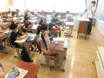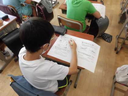 3年生は、理科の「チョウをそだてよう」の復習です。1学期実際にチョウを羽化させたことも思い出しながら体のつくりなどプリントでもう一度確認をしています。