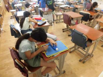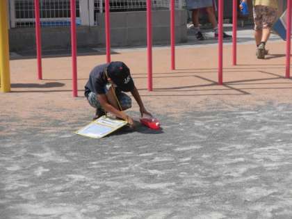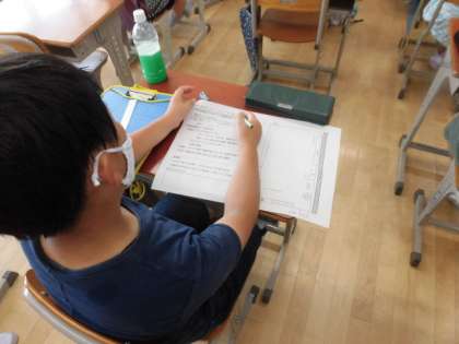 4年生は、理科の「雨水のはたらき」の学習です。ペットボトルに色水を入れた測定器を自作して、校庭の傾斜をはかっています。