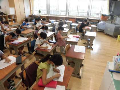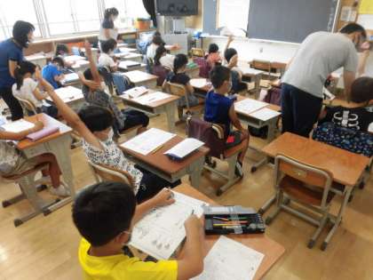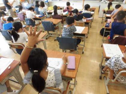 2年生は、「長さ」のプリントに取り組んでいます。手をあげると先生方がすぐに教えに来てくれます。