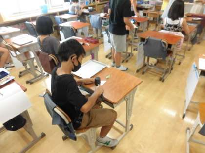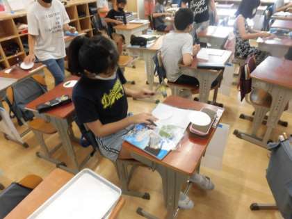 6年生は、理科の実験に取り組んでいます。日光にあたった葉の中のでんぷんを調べています。
