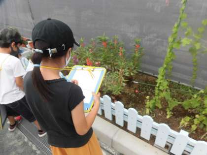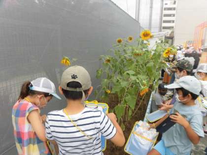 3年生が理科の授業で、花壇のヒマワリやホウセンカの観察をしています。ヒマワリはまだ実ができていませんでした。これからも観察続けていきましょう。