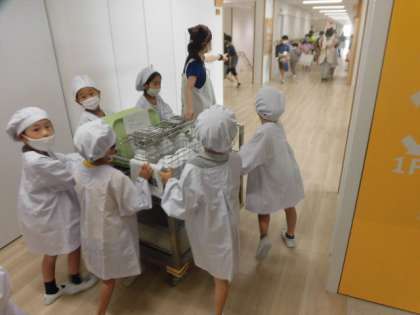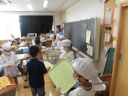 今日から2学期の給食がはじまりました。2学期からは運搬車を子どもたちが運びます。1年生もみんなで協力して気を付けて運んでいます。2学期の給食も前を向いて、パーテーションを立てての給食です。久しぶりの美味しい学校の給食、みんな静かに味わって食べています。