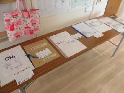 夏休みに自由研究に取り組んだ子どもたちの作品が廊下や教室に並べられています。どの作品も頑張って取り組んがあとが見られます。