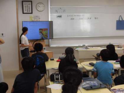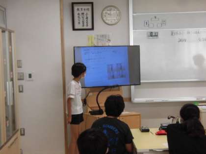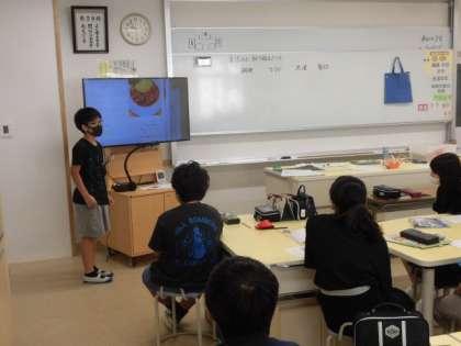 6年1組の家庭科の時間です。料理や掃除など、夏休みに家で取り組んだことの発表をしています。グループの代表が前に出て発表しています。グループからの推薦理由も発表していました。実際にやってみて、いろいろな気づきがあったようです。これからも家庭でできること見つけて実践していきましょう。