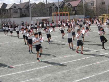 2年生の「エイサー2020 ダイナミック琉球」です。エイサーの軽快なリズムに合わせて一生懸命に太鼓をたたきながら踊りました。