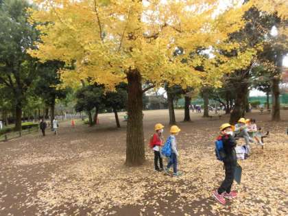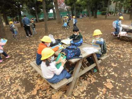 羽根木公園では、グループごとに木の実を拾ったり、色づいた葉っぱを拾ったりしました。拾ったものはビニールに入れて持って帰りました。持って帰れないものもカードに絵や文を書きました。