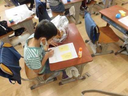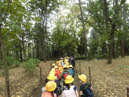 公園の中をみんなで少し歩いてから、学校まで戻りました、帰りの道も最後までしっかりとある行きました。担任の先生以外にも、主事さん方がたくさんついて、事故にあわないように気を付けてくれたのでお礼もしっかりと言えました。教室に入ってからは、カードに見つけてきたものをまとめました。楽しい秋さがしになりました。