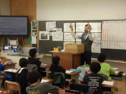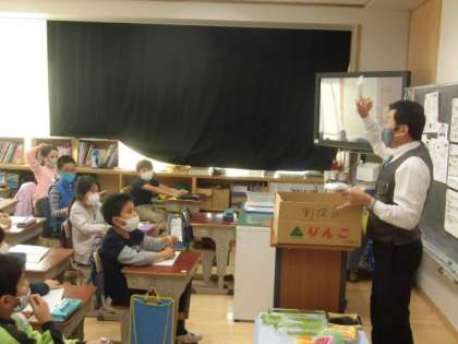 社会科の学習で、お店の人が売り上げを高めるためにどんな工夫をしているか調べてきた3年生。今日は、スーパーマーケットで働いている方に学校に来ていただき、工夫についてお話をしていただきました。子どもたちのために色々な品物も用意していただき、わかりやすくお話をしていただきました。ありがとうございました。