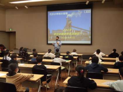 午後からの見学は、JFEスチール東日本です。最初に製鉄所の様子について、係の方からお話をしていただいたり、ビデオで学んだりしました。みんなしっかりとメモをとって学習していました。その後は、広い敷地の中をバスに乗って説明を受けながら見学しました。真っ赤な鉄の塊を薄く延ばすのを実際に工場の中に入って見ました。板が大きな音がする中でたくさんの水を使って伸ばされていく様子は、とても迫力がありました。また、真っ赤な鉄の暑さも実感しました。作業の様子は写真には取れませんので、お子さんからお話を聞いてあげてください。とても丁寧に教えていただきました。最後は「ご安全に!」という工場でのあいさつをして岐路につきました。帰校が遅れご心配をおかけし申しわけありませんでした。