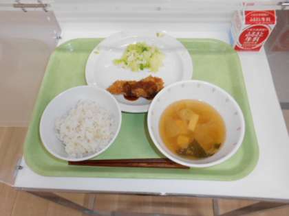 麦ごはん 牛乳 魚のフライ ゆでキャベツ