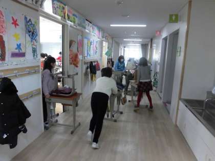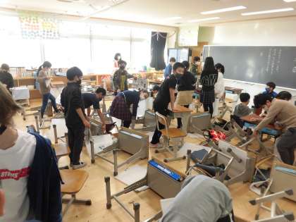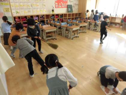自分の机や椅子の掃除、教室や廊下の掃除です。普段はなかなかできない、引き出しの中や脚の裏まで、「ありがとう」「お世話になりました」の気持ちを込めて丁寧に掃除していました。