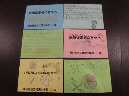 コロナ禍の中、新型コロナウイルス感染症から私たちの命を守っていただいている医療従事者のみなさんへ、2年生以上が「感謝の手紙」を書きました。自分たちも感染しないように頑張っていることも伝えながら、感謝の気持ちを表しています。これからも、体に気を付けて冬休みを過ごしていきましょう。