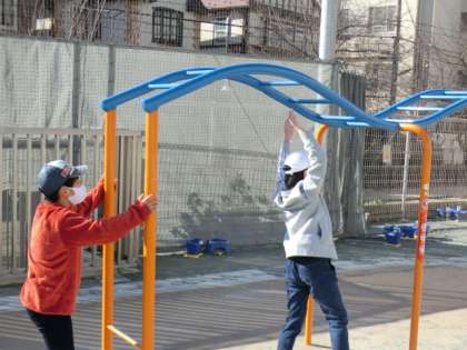 良い天気の中、久しぶりの校庭遊びです。友達と楽しく運動しています。遊びが終わった後は、しっかりと手洗いをしましょう。