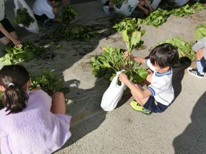 2年生が楽しみにしていた「小松菜採り」は、緊急事態宣言発令中のために中止となり、残念でしたが、昨日、副校長先生と主事さん方が収穫に行き、農園の方に学校まで運んでいただいたものを本日、子どもたちに配りました。とても広い畑で栽培されている様子や、収穫の仕方などを副校長先生が撮影したビデオや写真で学んだ後に配りました。世田谷区で昔から作られていて「江戸東京野菜」に認定されている「城南小松菜」という種類の小松菜です。今が旬の「城南小松菜」は、茎が甘く、葉にうまみがたっぷりとあり、苦みやえぐみがないので生でも食べられるそうです。たくさん持ち帰りましたので、お家で美味しくいただいてください。