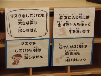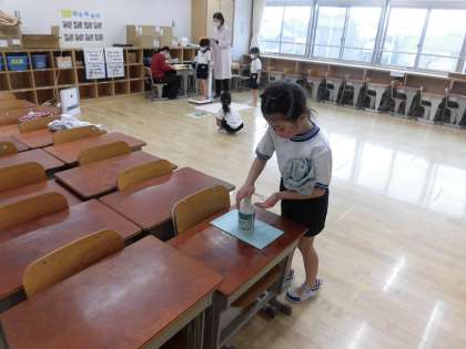 入室前後の手洗い・消毒も呼びかけています。また、計測器には、抗菌シートも貼ってあるので、子どもたちも安心して計測できています。