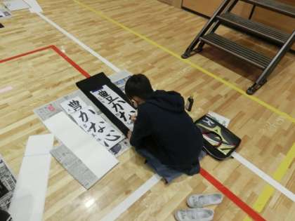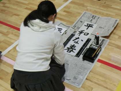 あたたかい土曜授業日でした。体育館では、5・6年生が書き初めを行いました。