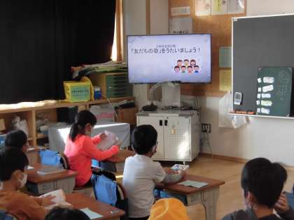 今朝の音楽朝会では、「友達の歌」を、心の中や小さな声で歌いました。