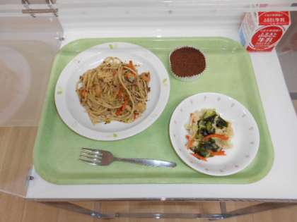 和風スパゲティ 牛乳 わかめサラダ おからマフィン