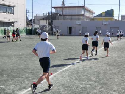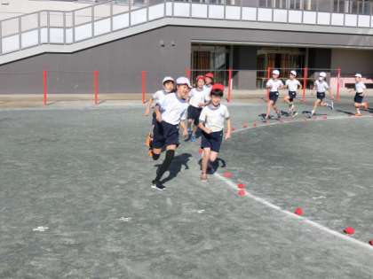 今日も良い天気の中、持久走記録会が行われていました。1時間目は、4年3組。2時間目は6年2組。3時間目は、5年1組。4時間目は5年2組です。どの学級も2つに分かれて、走っているペアの友達に残りの周を教えたり、記録を確認したりしながら記録会を行っています。みんな真剣に走っています。