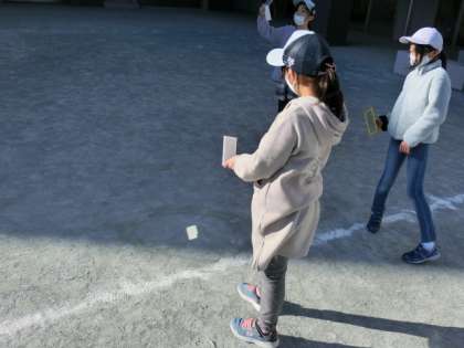 今日もとても良い天気でした。校庭では3年1組の子どもたちが、鏡をもって、太陽の光を反射させています。理科の授業の一コマです。どんなことを発見したかな?