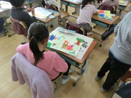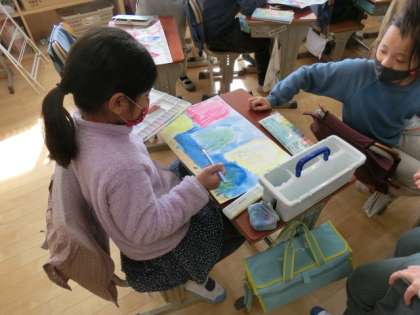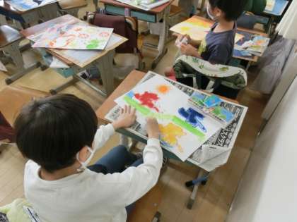 2年生の図工の時間です。絵の具も使って、カラフルな作品を作っています。