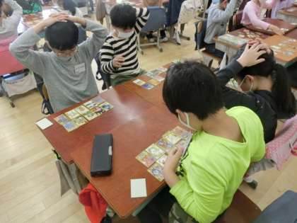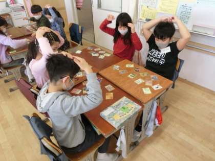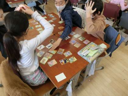社会科で、世田谷区について学習をしている3年生。今日は3年1組でせたがやかるたに取り組んでいました。先生が読む読み札を聞いて絵札を取っています。楽しく世田谷区のことを学んでいます。