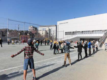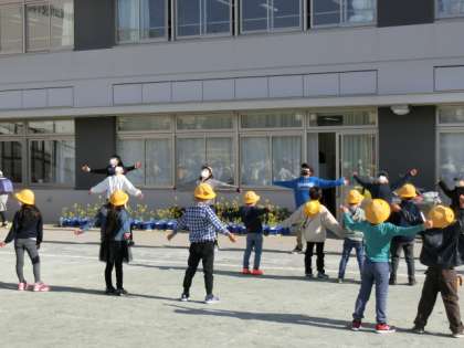 気持ちよく晴れた空の下、朝のラジオ体操をしました。