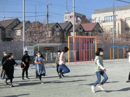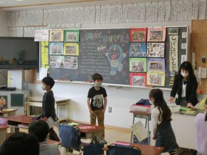 令和2年度も今日が修了式。朝の校庭では、6年生が最後の大縄を行っています。1年生の教室では、担任の先生からのメッセージをみながら、朝の準備をしています。