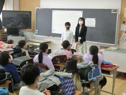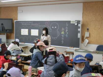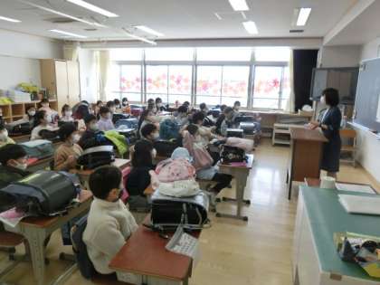 始業式の終わった教室では、担任の先生からお話を聞いています。担任の先生が変わった人も変わらなかった人も新たな気持ちでお話を聞いています。転入生のあったクラスでは、紹介の後に温かい拍手が聞こえていました。