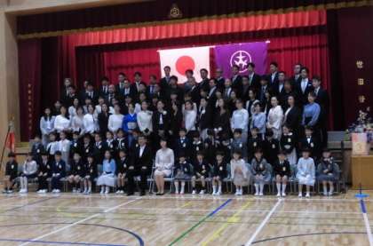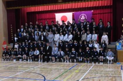 式が終わったあとは、学級ごとに記念写真を撮りました。写真を撮るときはマスクを自分で外しましたが、だれもおしゃべりをしないで静かに写真を撮ってもらっていました。