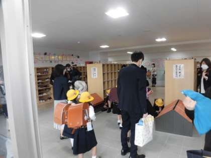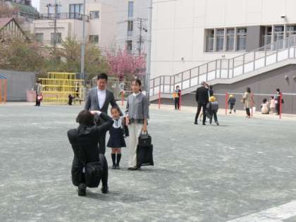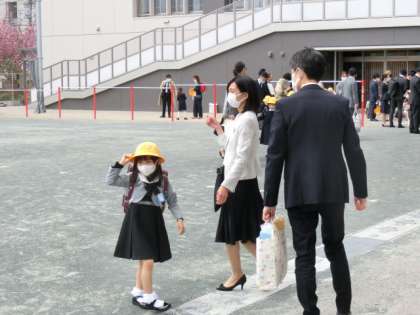 入学式を終えてお家の人と一緒に帰ります。黄色い帽子をかぶって、校庭で写真を撮ってもらっています。明日から、その帽子をかぶって、安全に登校してきてくださいね。みんな1年生を待っていました。明日は、たくさんのお兄さん、お姉さんがみんなを待っています。楽しい小学校生活を過ごしていきましょう。