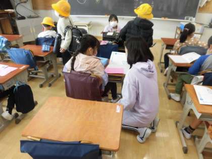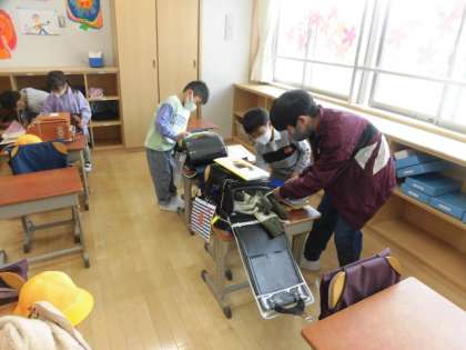 朝、6年生が1年生の教室で朝の支度のお世話を頑張ってくれています。