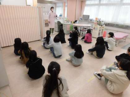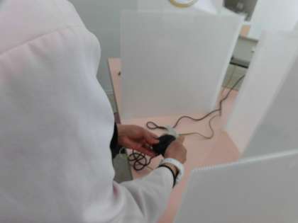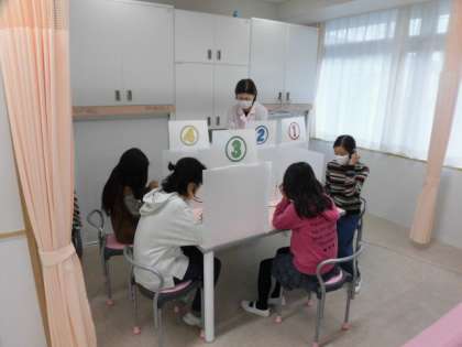 パーテーションで仕切って、3〜4人同時に検査しています。