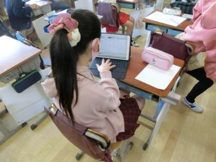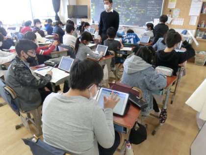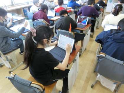 朝のランランタイム。運動は始まっていないので、朝の学習に取り組んでいます。6年生は、自分のタブレットを使って、ベーシックドリルを行っています。
