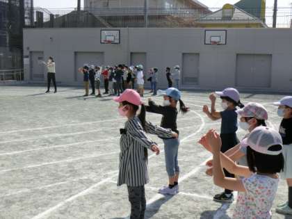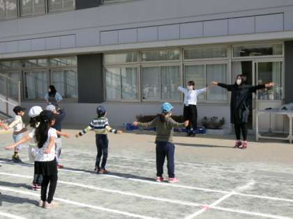 朝持久走の準備運動として、ラジオ体操にも取り組みます。