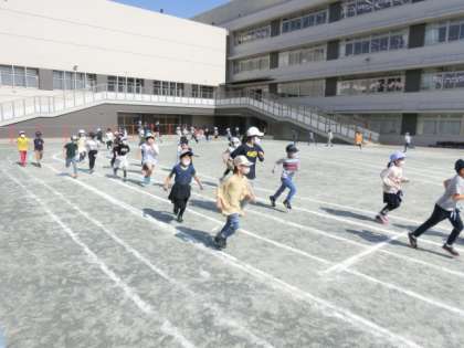 トップバッターは、2年生!気持ちの良い青空の下、力いっぱい走っていました。ついついスタートダッシュをしてしまい後半バテてしまう子もいましたが、同じペースで走り切れるように声をかけていきます。
