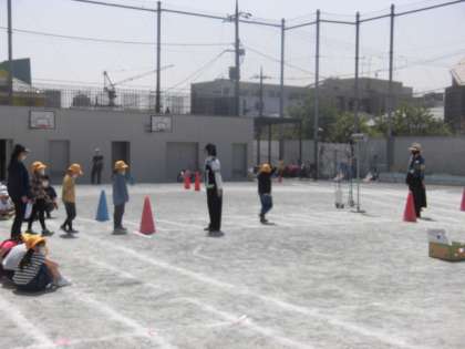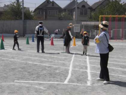 1人ずつ、校庭に描かれた道を歩く練習をしました。交差点では左右を確認して進んだり、横断歩道で手をしっかり挙げて渡ったり、お話をよく聞いてできました。