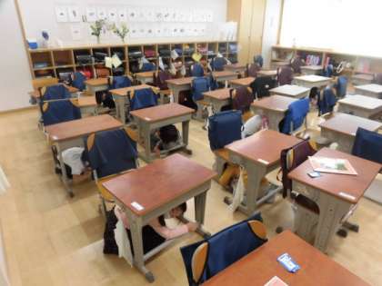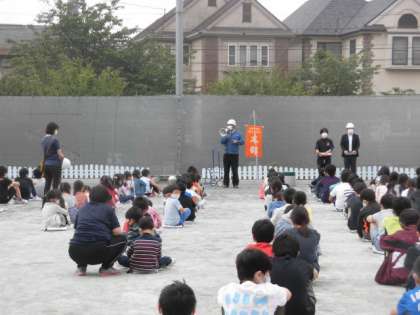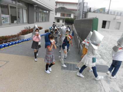 火災の想定ということで、ハンカチで鼻と口を覆って避難できた人も多くいました。手洗いの習慣がしっかりついている人は、ポケットにいつでもハンカチが入っていると思います。ハンカチは、火災時にもとても役に立ちます。毎日必ず身につけるよう、ご家庭でも再度ご確認ください。