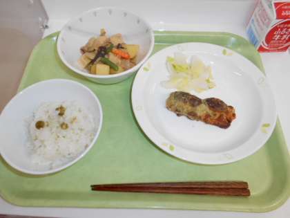 グリーンピースごはん 牛乳 新じゃがのそぼろ煮