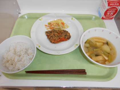 麦ごはん 牛乳 魚のごまフライ 野菜の和風ドレッシング みそ汁