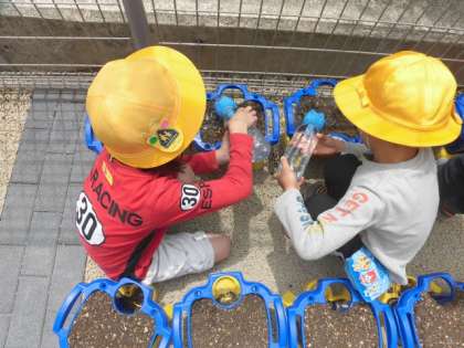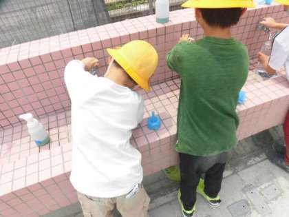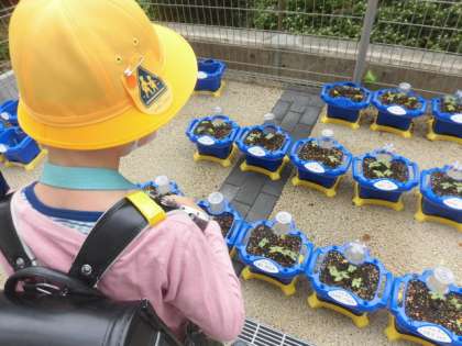 1年生が頑張って植えたアサガオ。どの子の鉢にも小さな葉っぱがでてきました。大きく育つようしっかりとお世話をしていきましょう。