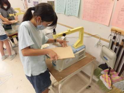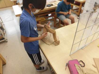5年3組の図工の時間です。電動いとのこを使って土台を切り取ったり、切り取った土台に電動ドリルで穴をあけたりしています。一つ一つの手順を丁寧に行っていました。4か所空けて穴には、アルミの針金を入れて形を工夫してそこにストッキングをかぶせます。個性的なオブジェができあがっていきました。