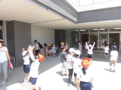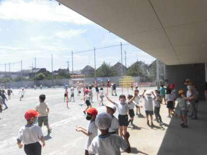 今日は、朝から天気も良く気温も高くなりました。休み時間の体育館の近くでは、子どもたちが手をあげて何かしています。体育館の尚から、ミストがでるように装置を取り付けています。今日は、気温も高かったので大活躍です。写真では醜いですが細かなミストが出ていて、涼しく感じます。