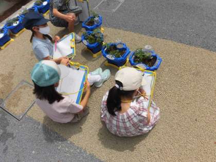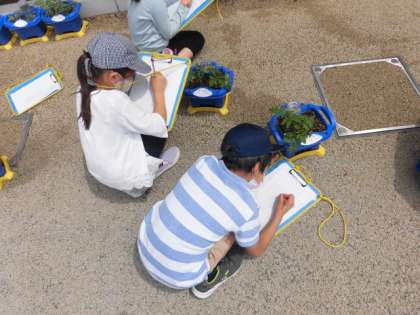 2年2組の子どもたちが、野菜の観察をしていました。雨の日もあり、いつの間にか大きくなっている葉を見て、「大きくなった」と言いながら、葉のかたちやにおい、手触りなど観察しながらカードにまとめています。たくさんの気づきが書かれていました。