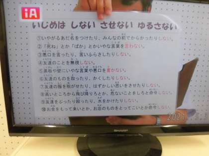 今朝は、TV放送による児童朝会がありました。校長先生から「いじめについて」のお話がありました。